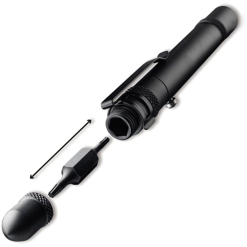 • 4.5" overall. Pocket clip. Lamy refill M-22. Handle holds double-sided Torx bit (T6 and T8). Practical bayonet mechanism. Aluminum construction. Color: Black. Boxed.
